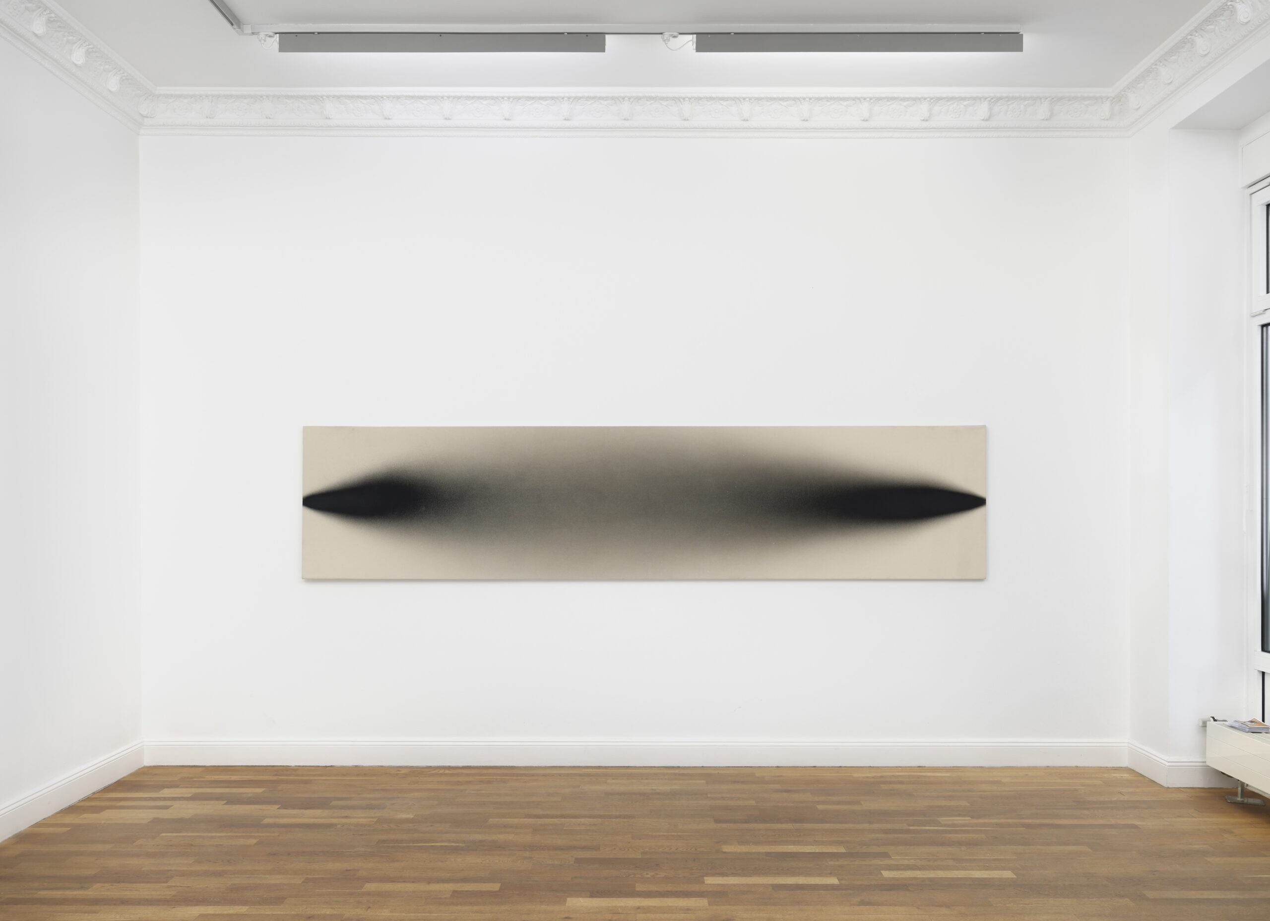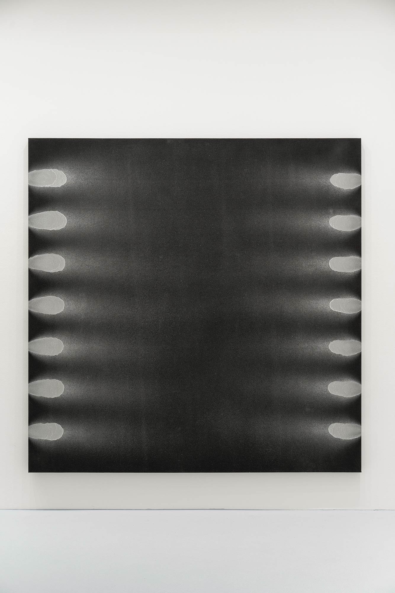 Eine der zentralen Arbeiten der Ausstellung ist die großformatige, schwarze Leinwand Untitled, entstanden 1971 in New York, aus der Serie der „Spray Paintings“. Michael Venezia bearbeitete die Leinwand von beiden Rändern aus mit sieben, gleichmäßigen Sprühstößen. Er verwendete dafür eine Emulsion aus Aluminiumpigmenten und Acrylfarbe, die er vor dem Aufspannen auf die liegende Leinwand sprüht.