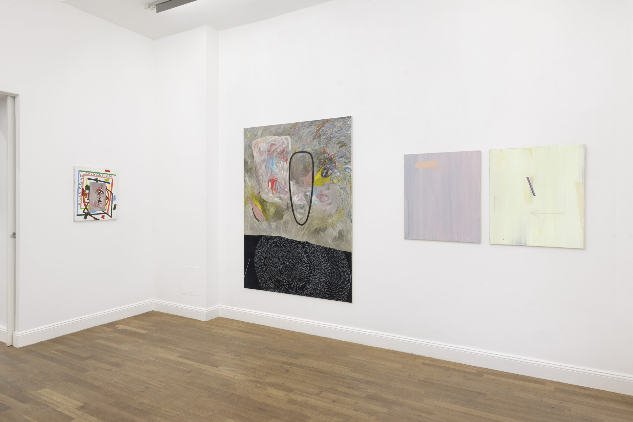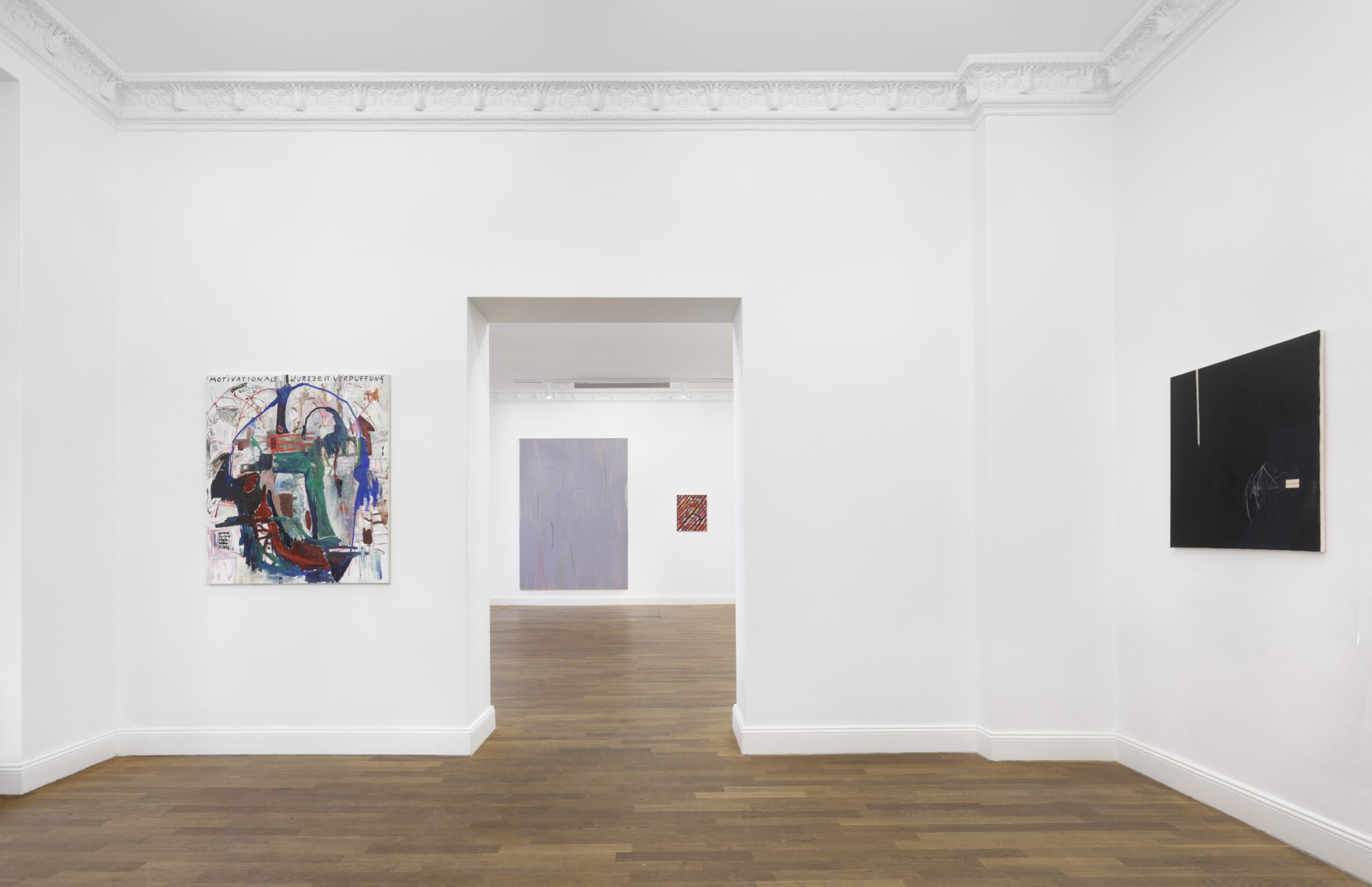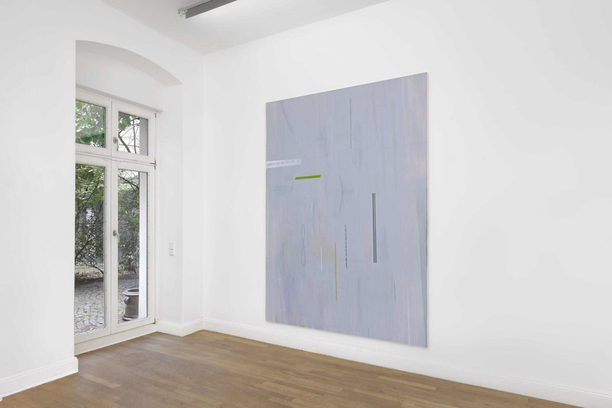 Franziska Hufnagel’s works appear to be driven forward with particular restlessness. Each painting presents a different challenge. The material of color acquires a tactile quality, and the individual image almost constitutes itself as a performance—not least because both the pictorial surface and the written surface are repeatedly extended, supplemented, and overpainted. This constant adding, braking, removing, and altering also defines Erika Krause’s works. Just as the origin of language is sound, here the line—in rudimentary reduction—becomes the starting point for formations of shape and script-like elements. These gestures appear as markings, signs, and abbreviations floating across glazed surfaces. In contrast to the previously mentioned tempo, the movement here seems at once to proceed and to stand still.